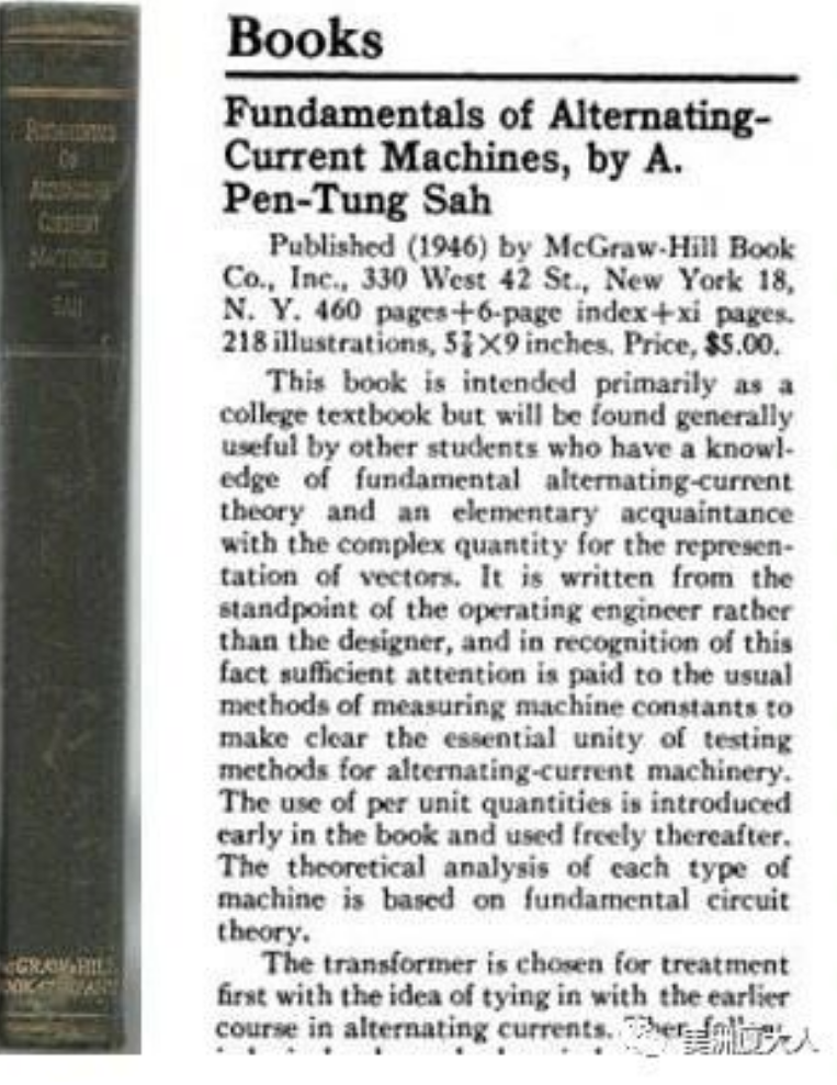 1944年6月,萨本栋先生接受美国国务院邀请,再度赴美讲学,在一些大学先后做了多场报告,其中有关交流电机学问题的讲授最具特色。当时他首先提出用标幺值系统来分析交流电机,引起电工学界强烈反响。不久,他根据在厦门大学讲授电机学所积累的资料和在斯坦福大学授课的新材料,用英文撰写了专著《交流电机基础》,提出许多新的论点和论据,受到英、美各国科学界高度评价,被誉为物理学、电机学巨著。